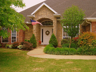 It occurred to me that our blog is called "The Banks Cottage" but we had no picture of it - so here it is! It's such a nice day that we want to be outside even if the allergies are killing us. We've been out alot lately, getting the yard how we want it. The backyard had no landscaping whatsoever, just wall-to wall grass, so that's where we've started (and I do mean started - this is going to take awhile). Don't you love before and after photos? They fascinate me, whatever they are - room remodels, hair & makeup, weight-loss accomplishments, renovated town squares, LiLo out of rehab - you name it. If its an improvement, I like it! And, whereas, I don't expect 'Cottage Living' to come do a photo shoot for their magazine, I do have a couple of before & afters of our landscaping attempts. Behold: Phase I!